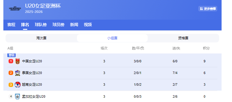 A组最后一轮,中国U20女足凭借肖亚飞在比赛第29分钟的禁区外远射,成功1-0击败泰国队。拿到这场胜利后,中国队小组赛三战全胜收官,以小组第一、进6球丢0球的成绩直通八强。